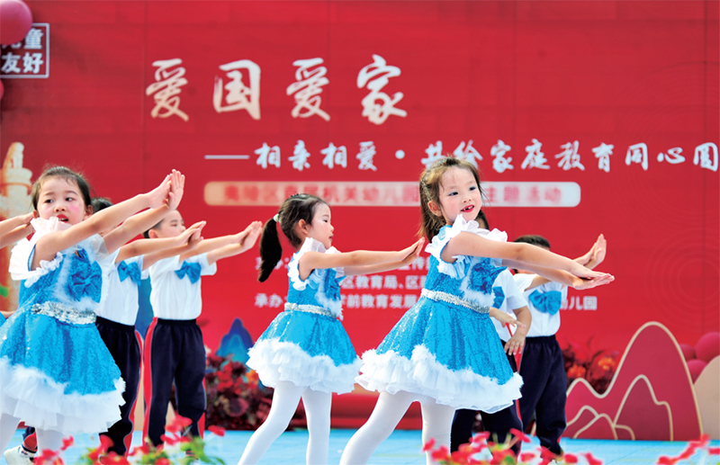 2024年9月29日,湖北省宜昌市夷陵区举办“爱国爱家——相亲相爱·共绘家庭教育同心圆”庆国庆主题活动,小朋友们以舞蹈、合唱等文艺展演形式,展现诚信、孝顺、勤奋、节俭等家风家训正能量。 视觉中国 张国荣/摄